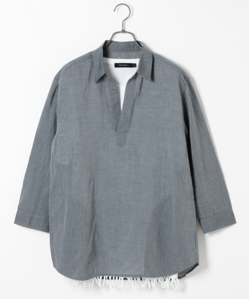 驚くほど軽やかな着心地のスキッパー。 紙の繊維とコットンと混紡し、清涼感のあるアイテムとなっています。 7分袖なのでタンクトップやTシャツ等、様々なインナーとの重ね着がお楽しみ頂けます。 ※撮影に使用しているインナー・小物は付属しません。