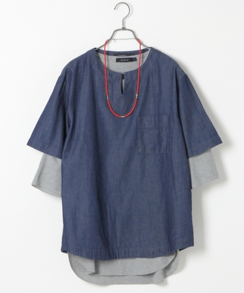 デニム素材で仕立てたメキシカントップス。 襟元のキーネック仕様が特徴! シャツのように軽い着心地なので、暑い季節にも着用が可能です。 ネックレスやハットの小物類でアクセントを付けるのがオススメ! ※撮影に使用しているインナー・小物は付属しません。
