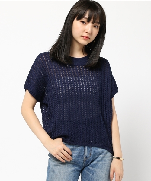 アクリルコットンニットをざっくりとした透かし編みで見た目にも爽やかな1枚に仕上げました。編地の生み出す縄目のストライプ柄やショートドルマンのゆるめシルエットもポイントになっています。チューブトップやキャミなどをインに、大人の肌見せスタイルを楽しんで。