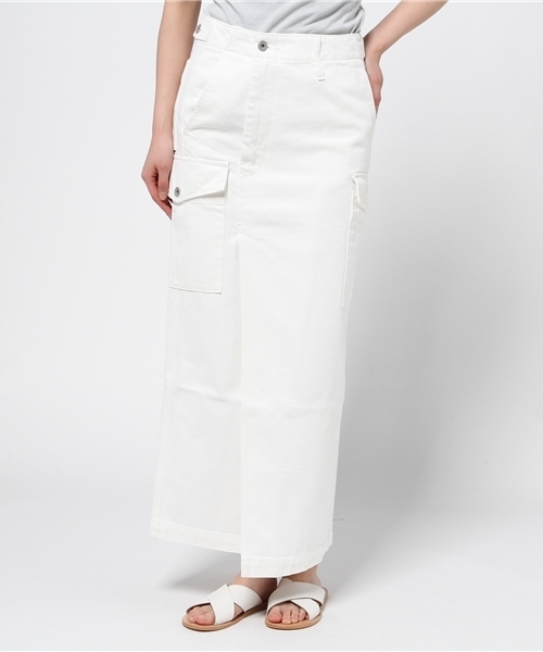 アメリカンラグシーオリジナルのデニムロングスカートです。 タイトなシルエットと前に配したスリットが女性らしいデザイン。 フラップポケットが上品な大人カジュアルを演出します。