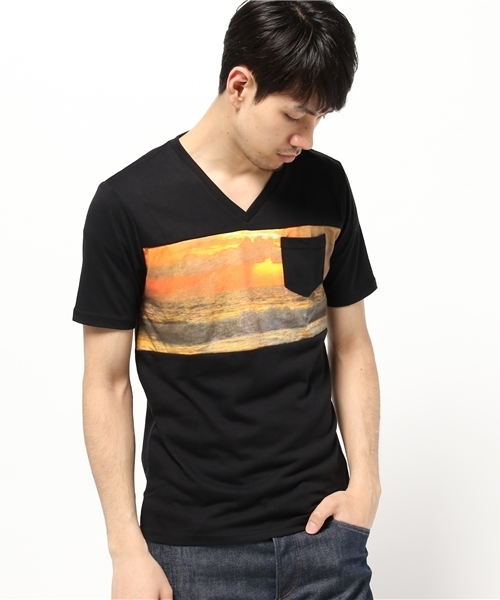 サンセットの転写プリントがリゾート感を演出してくれる半袖Tシャツ! 胸元にはさり気ないアイキャッチ効果と利便性を高めるベース型のパッチポケット付き! 夏らしスタイル作りにも最適で、デニムやショートパンツなど王道のカジュアルボトムと合わせて着たい一枚です☆