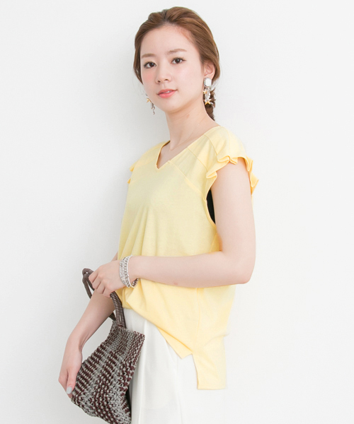 甘すぎないフリルデザインのお袖がポイントのTシャツ。フリルのようにタックを入れた程良いボリューム感がどんなシーンにもお召しいただきやすい一着です。暑い夏にもサラッとお召しいただけるドライタッチ素材を使用。ネックラインは広すぎず、デコルテラインが綺麗に見えるVネック。バックスタイルもV開きにすることで、より女性らしく、涼しげな印象に。スカートやガウチョパンツにINしても、もたつきにくくボトムスを選ばない優秀さも◎カジュアルながら、女性らしく着こなしていただけます。※透け感あり※この商品は、強い摩擦や濡れた状態での摩擦により色が移ることがありますので、ご注意ください。※この商品は、長時間日光や蛍光灯にあたると、変色する場合がありますので、ご注意ください。※その他お取り扱いに関しましては、商品に付属のアテンションタグをご確認の上、充分ご注意ください。