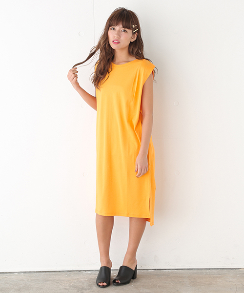 綺麗めなリヨセル素材の大人っぽいミディワンピース。ショルダーのタックがシルエットを綺麗に見せてくれます。