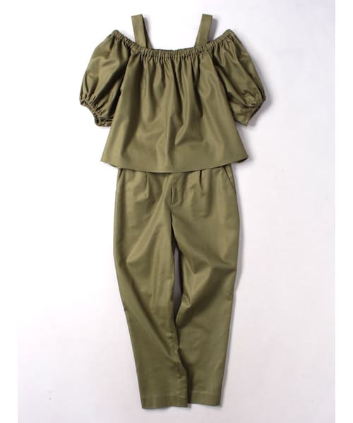 トレンドのオフショルダートップスとテーパードパンツの組み合わせが今年らしいセットアップ!!
