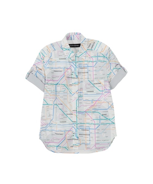 しっかりとしたハリ感が特徴のコットン素材を使用した半袖シャツ。メトロ路線図をモチーフにしたプリント柄で、その駅名1つ1つがブランドの歴代のアイテム名・キャラクター名・モチーフ名などになっています。ファーストシーズンに登場した“ぞうパン”などの定番アイテムをはじめ、非常にレアなものがアルファベットが表記されています。※こちらの商品は、ユニセックスで着用して頂けるアイテムです。Ladies Torso:H163.5 B80 W58.5 H86 着用サイズ:01サイズMens Torso:H180 C87 W78 H86 着用サイズ:03サイズ
