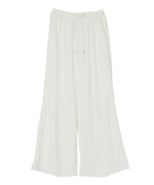 マットなサテン生地を使ったワイドパンツです。薄手で落ち感があり、すっきりとしたシルエットです。ウエストはシャーリングゴム仕様になっており着脱も楽にできます。