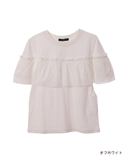 腕周りから身頃にかけて小花柄刺繍のフリルがついた半袖プルオーバー。見頃との異素材フリルが可愛いです。生地がコットン100%で着心地も◎。1枚で主役になるオススメのトップスです。※フリルは刺繍生地になります。