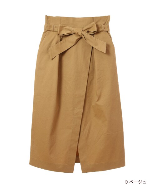 ウエストリボンがフェミニンさをプラスしてくれるひざ下スカート。ラップ風デザインなので正面の裾からすらりと見える脚がキレイです。ボリュームのあるトップスをINして着るのもオススメ。※裏地が付きます。脇にコンシールファスナーとホックが付きます。ウエストリボンは取り外し可能です。