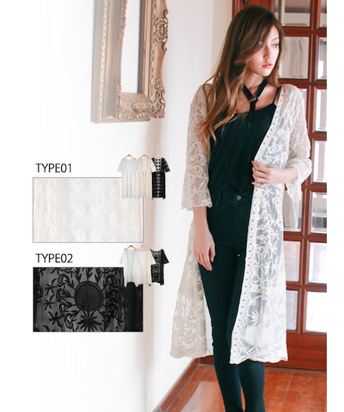 【メール便送料無料】【総レースロングカーディガン】総レースがエレガントな印象のラッセルレースガウン。トレンドのガウンで大人な抜け感もプラス。