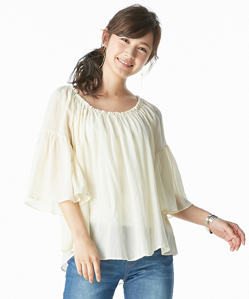 大人の女らしさは上品な肌見せで 女度が確実にアガル!ラグジュアリーデザインを普段に。 たっぷりのギャザー遣いが贅沢なブラウス。ふんわりフレアーがフェミニンな雰囲気で涼しく、気になるおなかやヒップがカバーできるうれしい一枚。衿口は総ゴム仕様、肩をずらすとトレンドのオフショルダーとしても着られます。途中で切り替えてたっぷりフレアーを入れた袖デザインも女っぽく華奢な印象。 ★デザインについて★ ふんわりそよぐブラウスとフリンジデニムでカリフォルニアスタイル。ほのかな透け感が甘い雰囲気のブラウスを小物で引き締めるのが大人の技。シルバーのバングルやウェッジソールのシューズ、そして、ブラックレザーのフリンジバッグでスパイシーにカッコよく。甘さと辛さの駆け引きを存分に楽しんで。 ★素材について★ シボ感のある薄手のコットン揚柳(ようりゅう)素材が肌に張り付かずさらっとした感触。 衿口のゴム部分はやわらか仕上げ、ストレスフリーな着心地です。 総ゴム仕様なのでオフショルダーとしても◎。 ★オフショルダーフレアーブラウスのコーディネート提案★ インナーにキャミソールを組み合わせたり、カーディガンやジャケットをさらっと羽織っても◎。 カラーパンツやスキニーデニムなどを合わせたシンプルコーデや、スカートときちんとシューズで品を残したコーディネートにも。 ストールやバッグ、アクセサリーで季節感をプラスして。 Sサイズなどの小さいサイズから大きいサイズまで幅広いサイズ展開も魅力的。