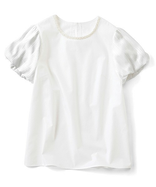 ビジュー&シアー素材で一枚でも、きちんと華やか 織り柄の入ったシアー素材のパフスリーブがフェミニンなブラウスは、身ごろが肌心地のよい綿100%のブロード素材で夏にぴったり。キラキラ輝く衿もとのビジューは、まるでアクセのような存在感。シンプルなパンツに合わせるだけで、大人の着映えコーデが完成します。 シアー素材のパフスリーブ ネイビーの袖はチェック、白の袖はストライプの織り柄がおしゃれ。腕を上げてもわきが見えず、二の腕カバーもかなう優秀デザイン。 衿もとを彩るキラキラビジュー 顔まわりを明るくしつつも大きすぎないサイズ感が知的で上品な印象。 シアー素材と心地よい綿100%の組み合わせ 軽やかに透ける素材と汗をかいてもさらりと気持ちいい肌あたりのよいブロード素材。 ★フェミニンなブラウスのコーディネート提案★ デニムでややカジュアルダウンさせたコーデ、ニットワンピースに重ねたりなど、パンツともスカートとも相性がよく、上からカーディガンやジャケットを羽織るなどいろいろな着こなしができます! 足元はパンプスやブーティを合わせることで大人っぽく、スニーカーなどを合わせてヘルシーな装いにも。 アウターにはコートやジャケットを羽織りシンプルコーデに。 ストールやバッグ、アクセサリーで季節感をプラスして。