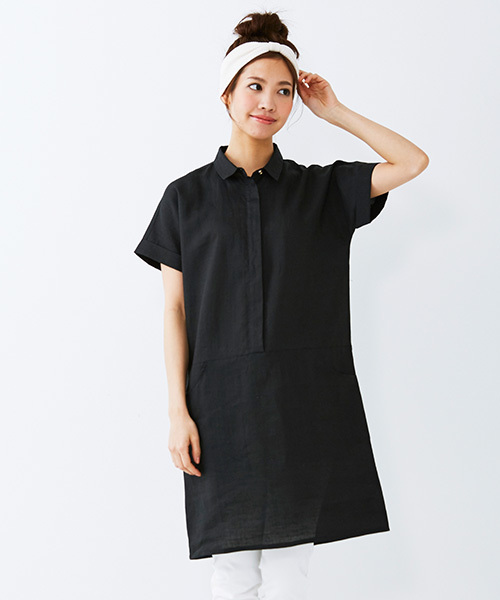 シャリッと肌心地がいい麻混素材 毎年大人気の麻混素材のチュニックが、今年はキリリとシャツライクな衿付きデザインで登場です。ほどよくきれいなドルマンスリーブや、ウエスト位置より少し下に入れた切り替え、シャリッと爽(さわ)やかなのにチクチクしにくい、上質な麻混の素材感もこなれた印象。すとんとしたシルエットで体形カバーも安心です。ゴールドのボタン遣いで着映え感抜群だから、およばれにもぴったり。シックなブラック、オンもオフも便利なベージュ、夏の日差しにも映えるレッドからお好きな色をどうぞ。 ★デザインについて★ Front 袖口の折り返しできちんと感も演出。腰の切り替え部分には、両サイドにポケット付き。 フロント部分をすべて留めると一番上のボタンだけが外側に見える比翼仕立て。 ★素材について★ 麻のシャリ感と綿のやさしい肌ざわりを両立させた綿麻混素材。上のふたつだけゴールドのボタンで、衿もとを開けたときに顔まわりが華やかに。 ★チュニックワンピースのコーディネート提案★ カラーパンツやスキニーデニムなどを合わせてシンプルコーデに。 季節の変わり目にはロングカーディガンやブラウスをさらっと羽織って。 ストールをおしゃれに巻いて全体にまとまりを作るのも◎。 ワンピース同様、1着でいろいろな着こなしが楽しめるアイテムです。 Sサイズなどの小さいサイズから大きいサイズまで幅広いサイズ展開も魅力的。