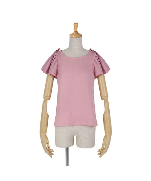 夏のワードローブに加えたい着まわし力抜群な一品。 ふわっと揺れるフリルのお袖がコーディネートにガーリーさをプラスしてくれること間違いナシです♡ 肩にあしらわれたグログランリボンもアクセントに◎ お手入れしやすい素材なのも嬉しいポイントです。 MATERIAL: モデル身長: 150cm ポリエステル65%コットン35% made in China サイズ着丈胸囲肩幅袖丈 Free58cm87cm29cm16cm