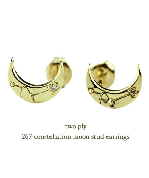 「 Constellation Moon 」 月の中に描かれた星座が神秘的な 華奢ピアス ムーンのシェイプも程よいアールがかっていてエレガントな雰囲気です。 星の輝きにみせたダイヤモンドが一粒さり気なく輝きます。 お顔周りを華やかに、そして優しく見せてくれる ムーンピアスです。 18金イエローゴールド製