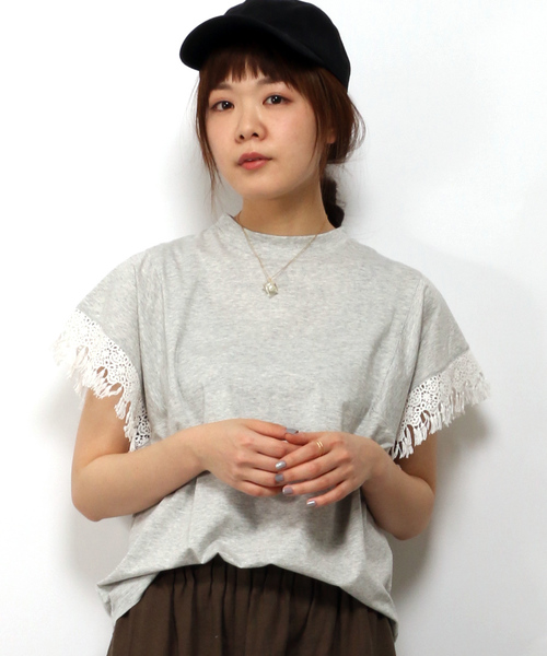 きれいな風合いが出て、形態安定性のあるシルケット加工を施したプルオーバー。袖口にはレースを配してシンプルなTシャツを甘く味付け。レースはよく見ると小さなタッセルがたくさん付いて、フリンジ風に仕上がった凝ったデザインです。身幅にもほどよくゆとりがあり、安心感の高い着心地となったアイテム。