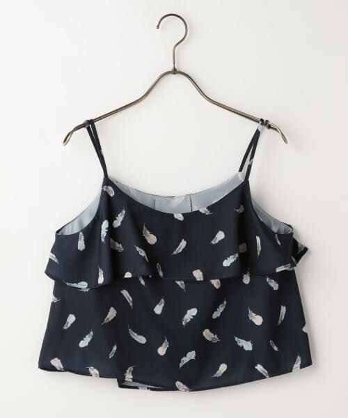 フェミニンな雰囲気が可愛い、フェザー柄のキャミソール。Tシャツやカットソーの上に重ねるだけでトレンドスタイルが完成する便利なアイテムです。肩ひもはアジャスター付きで、サイズ感の微調整が可能♪同シリーズのパンツとセットアップで着こなすのも◎。