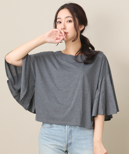 ラッフル袖が可愛いカットソー。前後逆で着用でき、襟ぐりの変化も楽しめるアイテムです。ややショート丈のデザインはスカートにもワイドパンツにもあわせやすい。 *アームホールは25CMです。 ※洗濯方法:手洗い