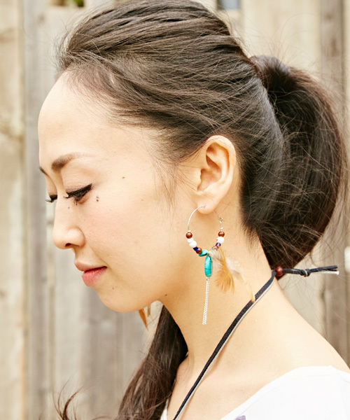 大きめのフェザーとドロップシェイプのターコイズをメインにしたボヘミアンピアス★印象的な耳元に◎コーディネートのアクセントにおすすめのフープピアスです。 ※こちらの商品は1点1点職人による手作りとなります。また天然素材を使用しております為、形や色合いなど若干異なる場合がございます。あらかじめご了承ください。 Amina Collection Co.,LTD.