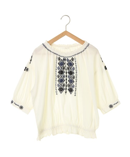 要所に愛らしいモチーフ刺繍を施した、華やかなエスニックムード薫るブラウス。 ナチュラルな風合いのインド綿を使用しており、柔らかく涼しげな着心地がこれからの季節にも最適です。 ギャザーをたっぷり入れたふんわりとしたシルエットは、裾のゴムシャーリングでメリハリもアップ。ネック周りにもゴムが入っているのでオフショル風にも着こなせ、パフスリーブが二の腕周りもふんわりとカバー。 ワンカラーデザインで着回しやすい1枚は、ワイドデニムを合わせたガーリーボヘミアンがおすすめ◎