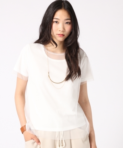 ベーシックなカットソーにチュールを重ねたフェミニンなトップス。 トレンドの透け感のあるデザインに仕上げています。 チュールとトップスのセットアイテムなので、重ね着はもちろん、 手持ちのプリントTEEや柄アイテムと合わせたスタイリングもおすすめです。 インナーによって様々な雰囲気に変化出来る着回し抜群のアイテムです。