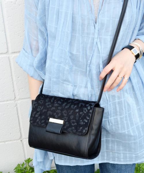 レオパード柄がコーディネートのアクセントにぴったりなショルダーバッグ。レオパード部分はハラコ風で、すこし秋を感じるデザイン。ブラックのボディとゴールドカラーの金具の組み合わせが大人の女性にぴったりです。Tシャツやデニムなどのカジュアルスタイルに合わせても、ちょっとキレイめなコーディネートにもマッチしてくれる優れもの。ひとつは持っておきたい絶妙なサイズ感で、重宝すること間違いなしのアイテムです。※末永く愛用頂く為に、アテンションタグ・洗濯ネームを必ずご確認の上、着用又はお取り扱い下さい。※画像の商品はサンプルです。 実際の商品と仕様、加工、サイズが若干異なる場合がございます。