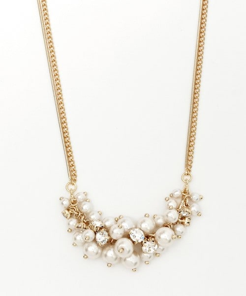 モチーフを房のようにあしらったネックレス。 十分にボリュームのあるフォルムが胸元を華やかに演出します。 チェーンは長めの華奢なタイプを2連に組み合わせ、全体のバランスを整え存在感を演出。 シンプルなTシャツやワンピースに合わせるだけで、ぐっと今年らしいコーディネートに仕上がるアイテムです。 結婚式などのパーティーにはもちろん、程よいカジュアル感で普段使いも出来ます。