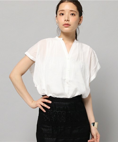 衿まわりにふんだんにギャザーと使用したローンブラウスです。 スキッパー開きで、顔周りをすっきり着こなせます。袖の大き目ラッフルも二の腕を目隠しする嬉しいポイント。また、2枚仕立てなのでアーム部分からの見えを防止した、細部までこだわりの仕上がりになっています。