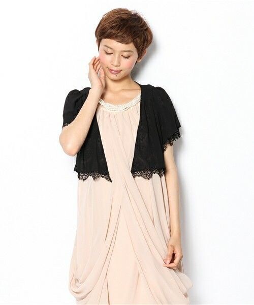 ◆ドレスシーンにぴったりのリバーシブルボレロ◆ ドレスコーデに1点プラスするだけで華やかな雰囲気になるボレロは、リバーシブルで着用可能。シンプルにキメたい時は無地を、エレガントなイメージに仕上げたい時はレースに・・・と、気分やシーンに合わせて選んでいただけます。格式のある場所では、肌の露出を控えるのが大人のマナー。こんなボレロが1枚あれば安心です。 店舗でのお問い合わせの際は、下記の品番をお申し付け下さい。 品番:40293707 model:H161 B80 W58 H89 着用サイズ:FREE
