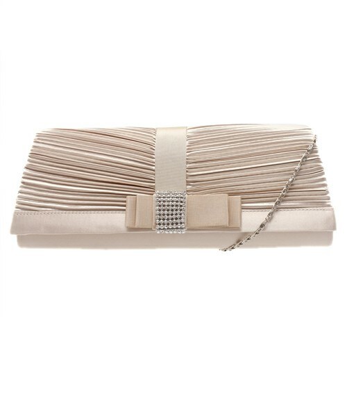 光沢のあるサテンと繊細なプリーツがポイント。小ぶりなリボンとビジューでクールな印象の中に可愛さもプラスしました。シンプルなデザインで幅広いドレスにマッチします。