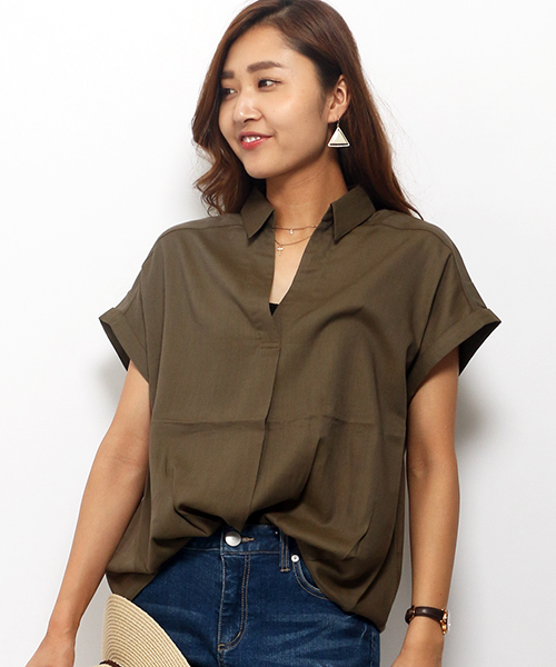 さっくりと開いたネックラインが女性らしい色気を作ってくれる、トレンドのスキッパーシャツ! 柔らかさとドライな着心地を兼ね備えたレーヨン×コットン素材で、汗ばむ季節も快適に過ごせますよ☆ 前後で着丈の長さを変え、裾にタックを入れているのでボトムアウトで着こなしても収まりが良いです!