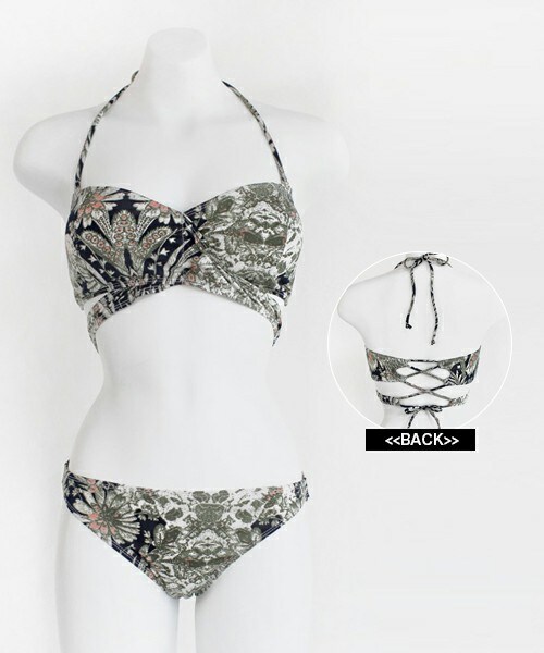 バストにボリュームを与えるツイストデザインにエスニックな パターンが大人っぽいビキニです。 バックスタイルまでセクシーで上品に演出するレースアップデザイン。 取り外し可能なホルターストラップ付き。 基本パッド内蔵で取り外し・追加でボリュームの調節もできます♪ ※WEARに記載してある金額と、DHOLIC通販サイトに記載してある金額にシステム都合上、稀に誤差が生じます。正しい金額はDHOLIC通販サイトに記載された金額です。
