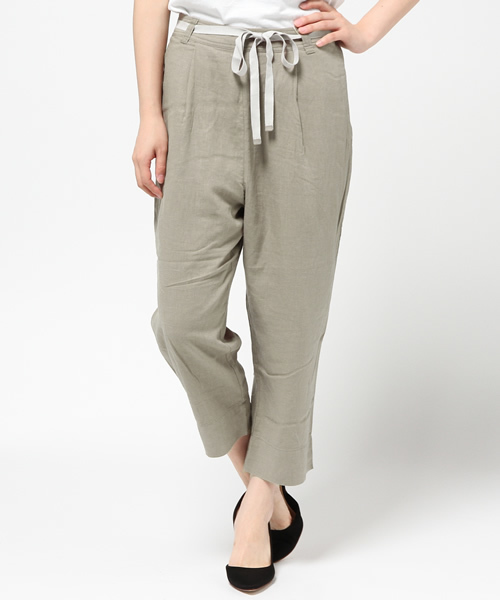 腰回りはゆったり、裾に向かって細くなるペグトップタイプのパンツ。スウェードリボンが付いているので、ボトムインでコーディネートした時に丁度よいアクセントになってくれます。ガウチョパンツに飽きてしまった方にもおすすめですよ♪