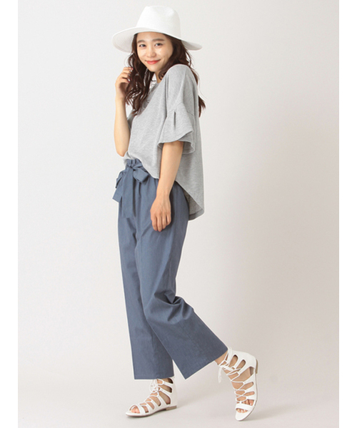 センタープレスを入れたシルエットが美脚を後押しするキレイめパンツ。存在感のある共布のウエストリボンで、メリハリ付けとスタイルアップを両立◎ウエストはゴム仕様で楽に穿きこなせ、トップはフリルのように仕上げているのでINスタイルもチャーミングに決まります。しなやかな風合いの生地に品の良さも漂い、オフタイムから通勤までオールラウンドに活躍する頼れるアイテムです。