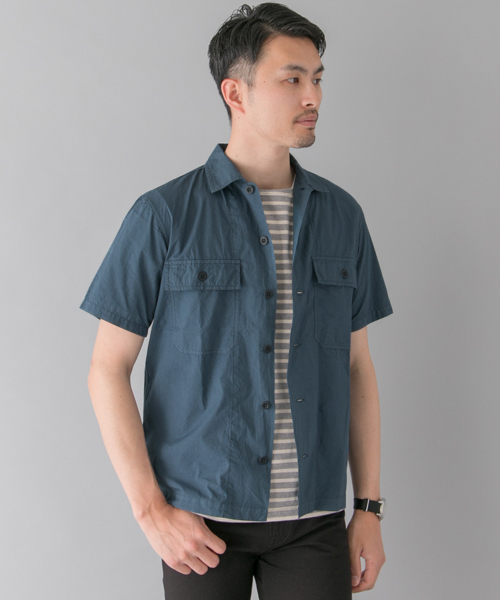 【WEB限定アイテム】 ミリタリーシャツのサマースタイルとして、薄手のコットンタイプライター素材で登場。 製品染めにより、抜け感のあるカラーに仕上げ、程よく無骨さが抜けたクリーンで爽やかなイメージに。 シルエットはボックスタイプにしているので、アウター感覚でTシャツやタンクトップの上からサラリと羽織りたい。 ※この商品は、縫製後に製品染めをしています。 そのため、一点一点に微妙な色、サイズ、風合いなどに違いがあります。その加工ならではの表情をお楽しみください。 ※その他お取り扱いに関しましては、商品に付属のアテンションタグをご確認の上、充分ご注意ください。