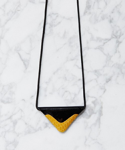 TOGA PULLA定番のマジックトライアングルネックレス。 今季はブラックのパテントレザーとイエローのリザード加工レザーのコントラストがシックな印象。 シンプルな形ながらも存在感があり、1点でも様になるデザインです。紐タイプで金属が苦手な方にもオススメです。長さ調整可能。 ■TOGA PULLA 2016-17 A/W Collection■ 温もりの中に刺激的なスパイスを加えて 相反する素材やカラーをミックスさせて、ユニークな一着を完成させている。ナイロンとメッシュ、ボンディング生地とサテンなど…タフな素材と柔らかな生地を組み合わせて、表情豊かに仕上げた。 “違和感”すら感じさせる配色もポイント。花柄はあえて蛍光色を用いて甘さを抑え、アニマル模様はシックなカラーを選んで品よくまとめた。ディテールには、ヴィンテージソファーやカーテンからのエッセンスを落とし込んだ。 ■TOGA■ デザイナー古田泰子は岐阜県生まれ。1994年、エスモードパリ卒業。卒業後はCMの衣装を製作する。2001年、トーガ・アーカイブスを設立。「TOGA」はギリシア神話の聖なる衣を意味する。イノセントとアンダーグラウンドの融合がTOGAの特徴。2001年AWより東京コレクションに参加。2004年、初の直営店を恵比寿にオープン。同年、別ライン「TOGA PULLA(トーガプルラ)」をスタート。2006年から発表の場をパリに移す。2011AWシーズンよりメンズライン「TOGA VIRILIS(トーガ ヴィリリース)」をスタート。