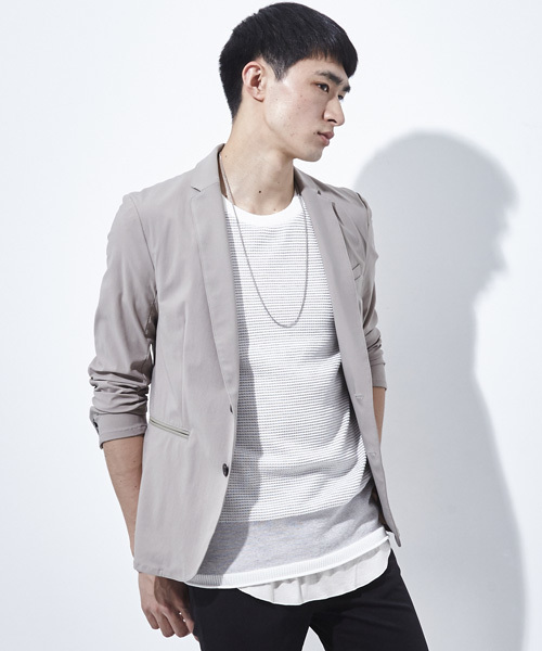 『着ている感じを出さないノンストレスのジャケット』 大人気のジャケットシリーズにライトウェイトの1着が登場。 ―素材― ナイロンとポリウレタンの混紡素材を使用したカット地。 シャリみを持たせる加工を施し清涼感のあるものに仕上げました。 抜群のストレッチ性で、Tシャツを着てるかのような快適な着心地を実現しております。 ―デザイン― 一重仕立ての軽さがリラクシングな雰囲気を与えるアイテム。 伸縮性があるため、細身のタイトな仕上がりながら快適な着心地とキレイなシルエットを実現。 モードなスタイリングから、袖口をラフにまくったカジュアルなスタイリングまで幅広い着こなしにマッチします。 暖かい時期のライトアウターにぜひお薦めの1着。