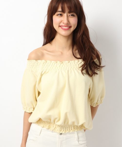 【ZOZO限定価格】 表面感のある生地を使用したオフショルトップス。 肩を上げてボートネック風にもつかえます。 夏も快適な柔らかいカットソーなので着心地〇♪ 適度なボリュームがあり、袖・裾はシャーリング仕様なのでスッキリとした着こなしに!