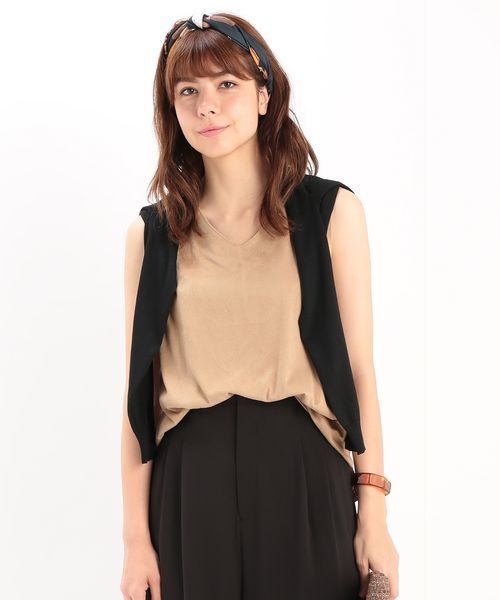 秋口まで着こなせる素材感で流行を一足先にキャッチ!バサッと着るだけで洗練された大人スタイルに。 今季トレンドのスウェード調素材を使用したノースリーブプルオーバー。 Vネックが女性らしく華奢に見せてくれ、着やせ効果も期待できます。 シックなカラー展開なのでボトムもモノトーンで揃えればミニマムな旬スタイルが完成します。 フロントインしやすいように裾に前後差がついているので、手軽にこなれ感を演出できます。