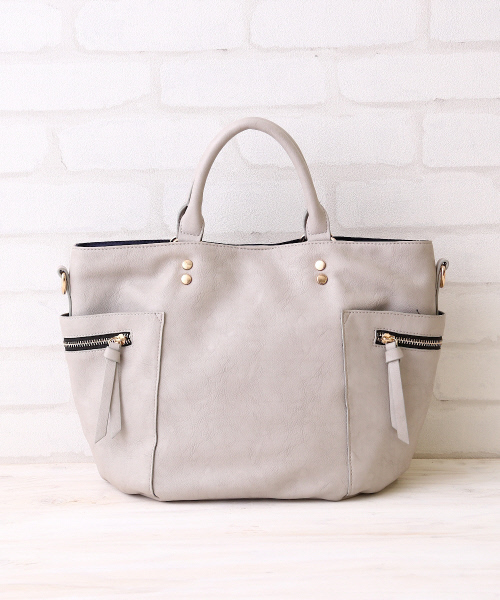 シンプルなボディにサイドのファスナーと小ぶりのスタッズがポイントのショルダーバッグ。 持ち手を外せばトートバッグとしてもお使い頂ける、うれしい2WAY。 A4の書類も入り、オンオフどちらでも使える上に、合皮を使っているので汚れてもお手入れ簡単の優秀バッグ。