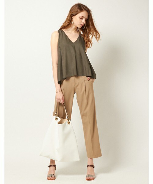 清涼感のある肌心地の良いレーヨン素材のノースリーブブラウス。 Vネックの開きやアームホールなど、女性が美しく見えるように計算されたこだわりのシルエットが魅力です。 肩に入ったタックが柔らかい生地に立体感を出し、リラックスした着心地に。前後の着丈に差をつけることで、足長効果も◎。 ノースリーブなので1枚でのコーディネートはもちろん、インナーとしても活躍する1着です。