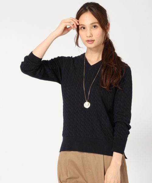 上質カシミヤ混アイテム 上質カシミヤ混のニットシリーズでシンプルなVネックニット。 コットンカシミヤの柔らかな素材感で着心地も良く、立体感のあるケーブルの編地が表情豊かな1枚。 シンプルなシルエットにトレンドのVネックデザインがワードローブにも活躍すること間違いなし! カシミヤ混でありながらもご自宅でのお手入れ(手洗い)が可能なのも魅力のポイントです。