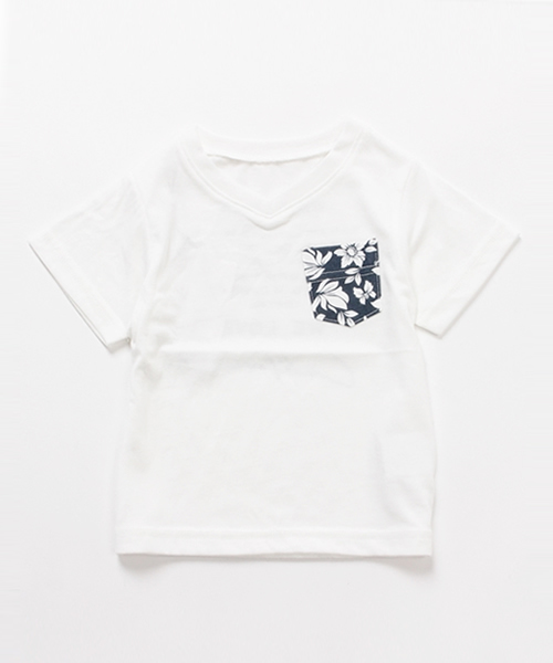 柄をあしらったポケットがポイントになった大人も顔負けのスタイリッシュなTシャツ☆ 背中には英字のメッセージロゴをあしらい、バックショットでのアピールもぬかりなです♪ フロントはVネックになったちょっぴり大人っぽい仕様。首元がすっきりすることで、涼しく着られるのも、汗っかきのキッズには嬉しいポイントに☆