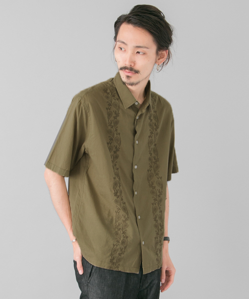 フロントにペイズリー調の刺繍を施した、オリエンタルなテイストを感じる半袖シャツ。 ガーゼに近い、非常に薄い生地を使用し、見た目にも涼しげ。 また、アロハシャツのようにボックスシルエットにし、夏のリゾートを思わせるディテールに仕上げています。 抜け感のあるボトムをチョイスして、リラックス感のあるスタイルで着こなしたい。 ※この商品は、素材の特性上、激しい動きで強い力がかかったり他のものに引っ掛かったりすると縫い目が開いたり、目寄れがおこることがありますので、お取り扱いの際はご注意ください。 ※その他お取り扱いに関しましては、商品に付属のアテンションタグをご確認の上、充分ご注意ください。