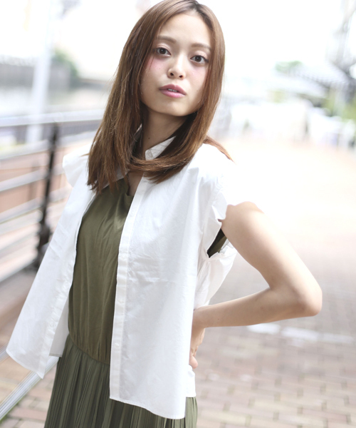 大人の可愛らしさを演出!!張りのあるタイプライター素材のため、程よいボリューム感をキープする事が出来ます。それでいて着心地も申し分ありません。シンプルなフロントに、アーム部分にはフリルを施しキュートなデザインに仕上げました。裾に向かってやや広がるAラインシルエットで、パンツでのアウトスタイルにも相性抜群!サロペットと合わせた、カジュアルなスタイリングもオススメです♪旬のワイドパンツともガーリーなスカートとも合わせられるスタイリングの幅広さが魅力。お好みのコーディネートを自分流で楽しんでいただける1枚です。