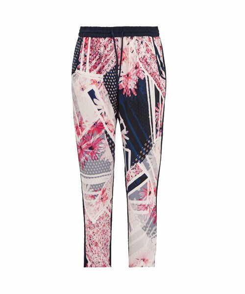 ・前身頃全体にフラワー柄のオリジナルテキスタイルがプリントされた ・両サイドポケット ・ウエスト部はゴム伸縮 ・右バックにフェイクポケット