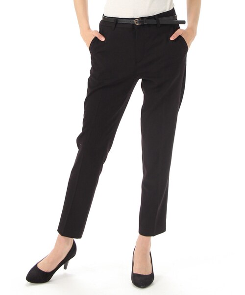 オンオフ使えるきれいめパンツ。センタープレス入りできちんと感のあるテーパードパンツ。伸縮性のある生地を使い、着心地よく仕上げました。ベルト付きなので、小物にこだわったおしゃれスタイルが簡単に完成します♪