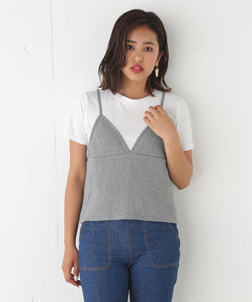 カット素材ですが、KNITに近い厚手のリブ素材を使用しており今季感を出しています。切替を多く入れることでシンプルながらデザイン性のあるキャミに仕上げています。
