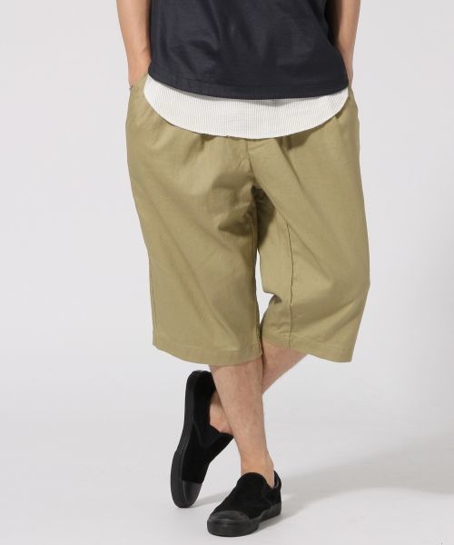 トレンドのワイドシルエットのハーフパンツが登場。膝下丈+ツータック仕様で、穿いたときのボリューム感はインパクト大!綿麻のカツラギ生地を使用しているため、清涼感があり快適な穿き心地なのもオススメのポイント。ロング丈のトップスやビックシルエットのアイテムを取り入れることで今年らしいコーディネートになるのでオススメです!※光の当たり具合で、商品と画像の色に若干差がある可能性がございます。ご了承ください。