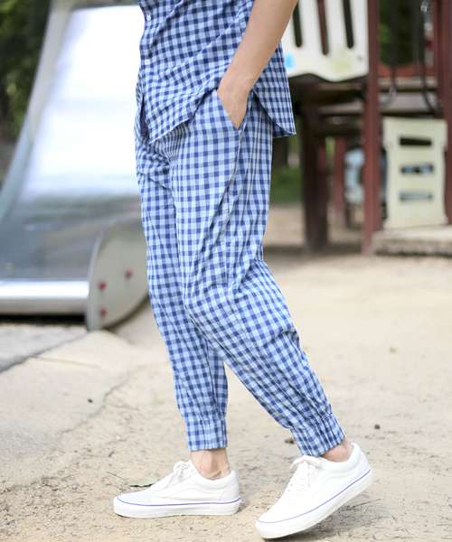 インディゴ染めをしたチェック素材が雰囲気抜群! 経年変化を楽しんで頂きたい1品! トレンドのジョガーパンツを軽めの素材で お作り致しました。 シンプルで穿き心地の良いこちらは ルームウェアとしてのご使用にも最適です。 インディゴ染めを施したチェック素材は 着込む事で退色の経年変化も出てきます。 長年の着用でジーンズとはまた一味違った 味わいを楽しめるアイテムです。 D16SS-609のインディゴチェック半袖シャツや D16SS-479のインディゴチェックワークシャツ等の アイテムと合してセットアップでお楽しみ頂けます! トレンドのワンマイルウェアとして是非ご検討頂きたい アイテムです!