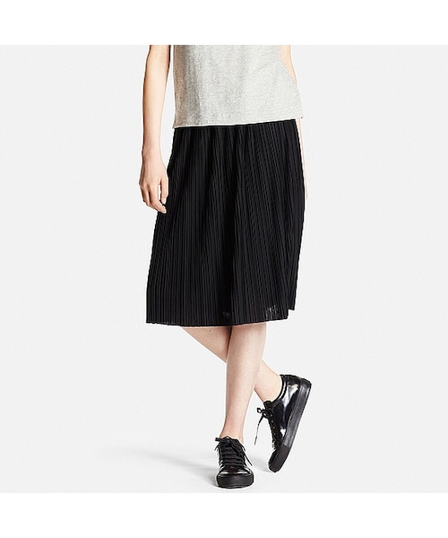 細かなプリーツがしなやかに揺れるスカート。見た目に軽やかで女性らしいエレガントさを引き立ててくれます。少し長めのひざ下丈なので、トレンド感のあるスタイリングが楽しめます。ウエストはゴムでラクにフィット。
